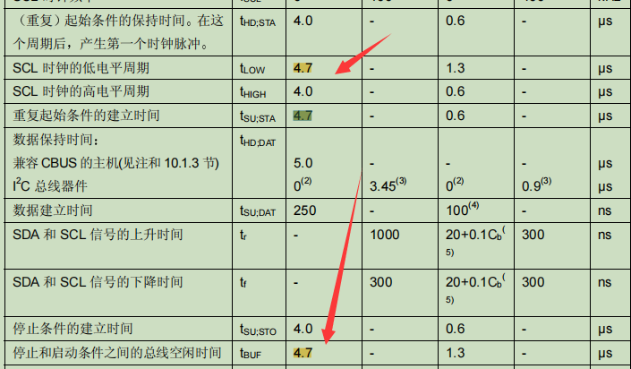 首先为了保证I2C的SDA和SCL的电平的稳定性,一般配置后都需要延时一段时间保证电平的稳定性,网上说是大于4.7us,我在I2C协议手册找到了这个条件。