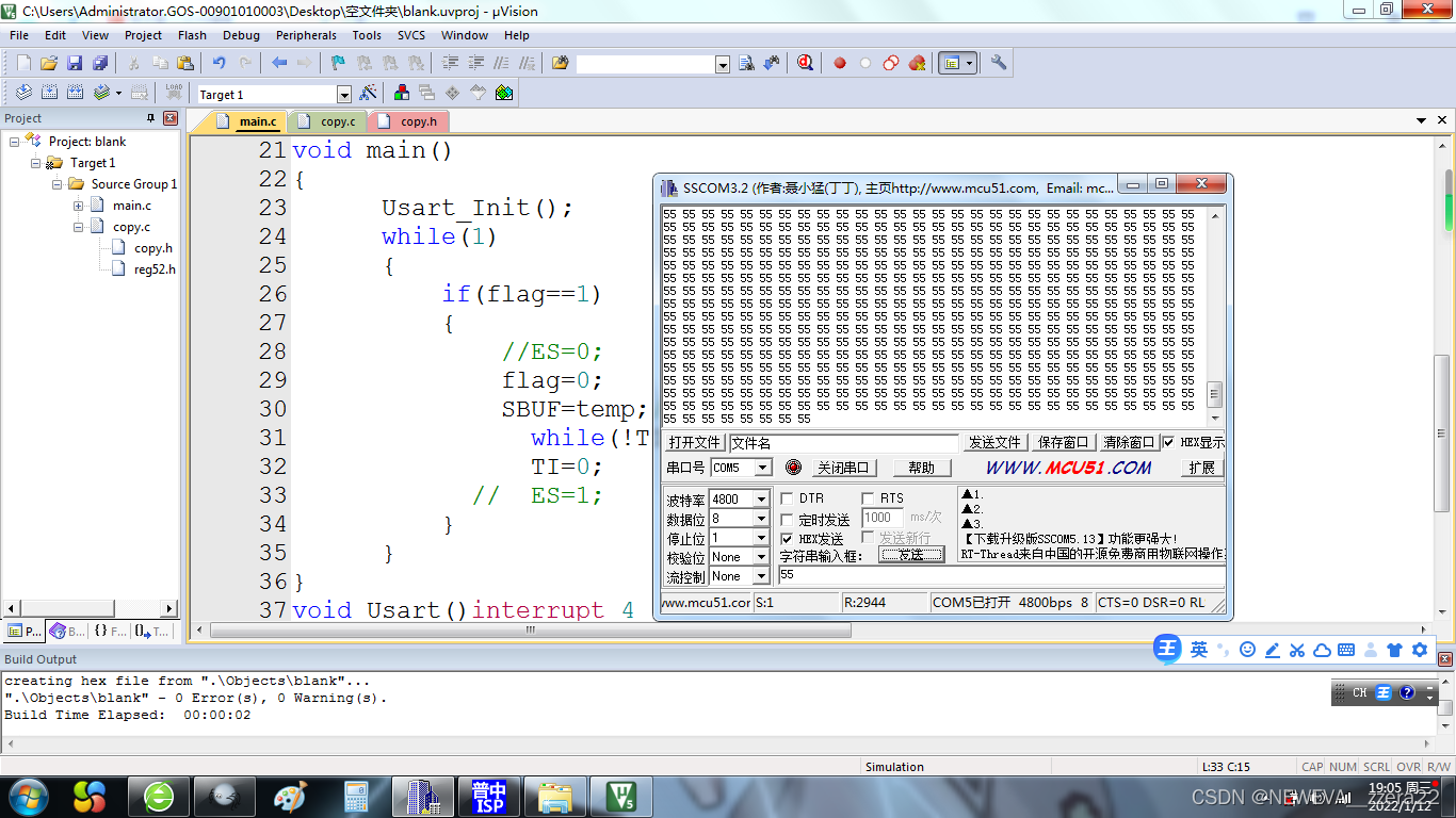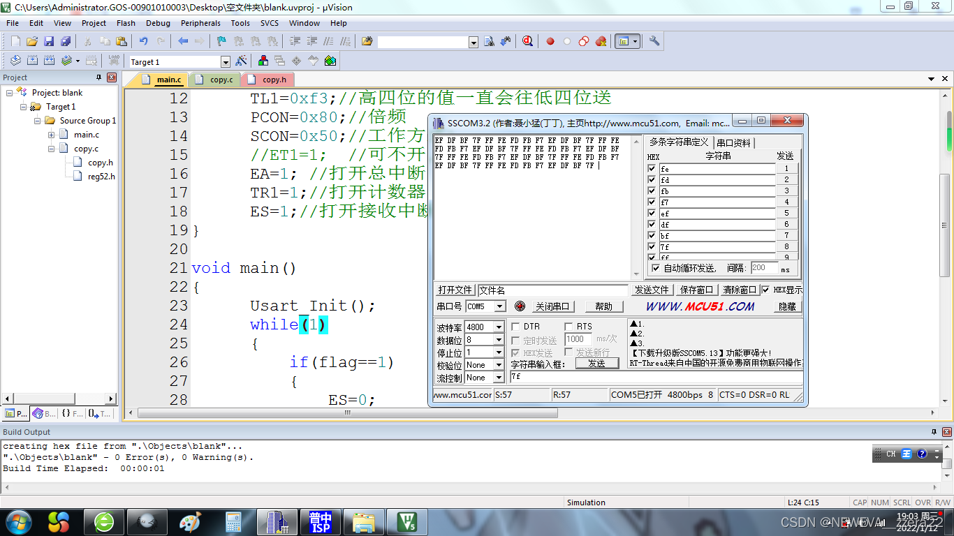 void Usart_Init() { ?? ??? ??? ?TMOD=0x20;//定时器1方式2自动重装? ?0010 0000(方式2)高四位启动定时器1 ?? ??? ??? ?TH1=0xf3;//4800倍频,12Mhz//倍频之后串口调试还是选择4800波特率 ?? ??? ??? ?TL1=0xf3;//高四位的值一直会往低四位送 ?? ??? ??? ?PCON=0x80;//倍频 ?? ??? ??? ?SCON=0x50;//工作方式1? ? 0101 0000? ?? ??? ??? ?//ET1=1;?? ?//可不开,此开关打开,led初始全亮 ?? ??? ??? ?EA=1;?? ?//打开总中断 ?? ??? ??? ?TR1=1;//打开计数器 ?? ??? ??? ?ES=1;//打开接收中断 }