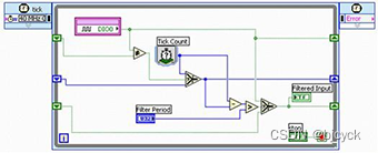 ? 在上图中外部While循环确保了所有代码均能连续执行,而写入布尔输入控件则通过条件结构启动着数据传递。 顺序结构中的第一框架将片选控制线(chip select line)设置为低电平,之后由中间框架写入数据位并将时钟线切换16次。 最终,第三顺序框将片选控制线(chip select line)设置回TRUE状态,并将数据线重置为默认的FALSE状态。 这一简单范例只是借助智能DAQ进行数字通信时的一项内容。 用户若想应用数字握手,便需为ACK(备用)和REQ(暂停)线准备2路通道,其中一路通道面向并行运作的时钟信号和数据线。 数字线会时常抖动,在使用机电接触时更是如此,然而用户可通过NI LabVIEW FPGA,选择不同方式,在数字输入线上添加去抖动滤波器。 在消除状态的错误改动时,数字去抖动滤波器确保数值的变化能够保持一段最短的时间,因而规避了因抖动引发的错误读取。 下图展现了如何通过智能DAQ实现此项功能的内容。 ?