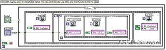 LabVIEW编程LabVIEW开发高级数据采集技术 操作数字IO 例程与相关资料 智能DAQ硬件提供多达160条硬件定时数字线,令诸多数字应用成为可能。 我们已经学习了如何使用数字I/O实现触发、同步及计数器/定时器的运行,而智能DAQ还可用于误码率测试、数字模式匹配、脉冲宽度调制、正交编码器和数字通信协议。 自定义或标准形式的串行接口均能直接通过数字定时框图编程来实现。 举例说明,SPI便是一款与硬件组件(如:微控制器或ADC)进行通信时最常用的串口协议。下图展现了在进行16位SPI通信时,3条必要数字线所对应的定时框图。 ?