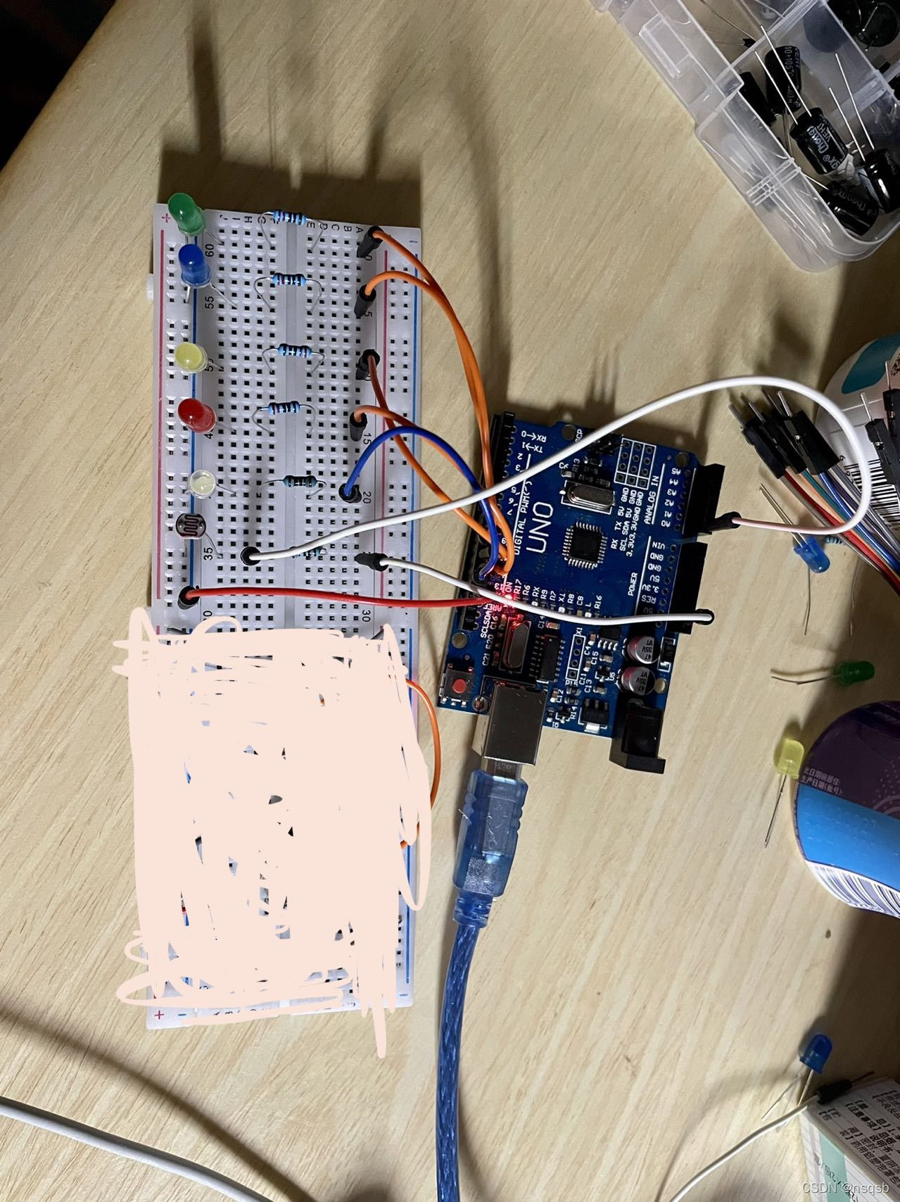 马上过年了,想到做一个炫彩的跑马灯放在阳台,又想着不用我自己去开灯就可以开启跑马灯。作为初学Arduino的小白,将书上的if函数和for函数简单结合用了一下。做了一个光敏的跑马灯。接线很简单led灯串联的是220的电阻(自己选合适的就行,一般>100的电阻应该就不会烧穿led了,如果另加电源那就不一定了,保证工作电流小于20mA)光敏电阻串联10k的电阻(光敏电阻阻值大,串一个大一点的电阻用于分压)。