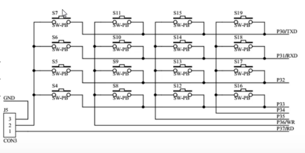 J5跳线帽接到2、3引脚,使按键S4~S7四个按键的另外一段接地从而成为4个独立键盘。在扫描按键的过程中,发现有按键触发信号后,先做消抖处理,当确认按键按下时,才进行相应的功能处理。