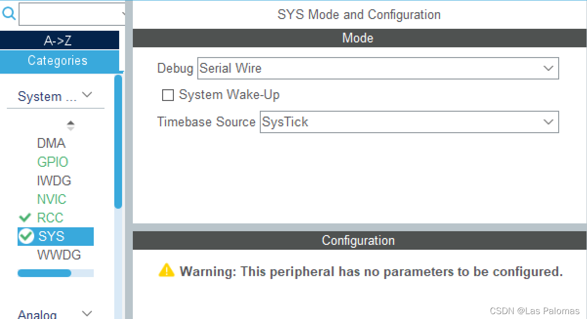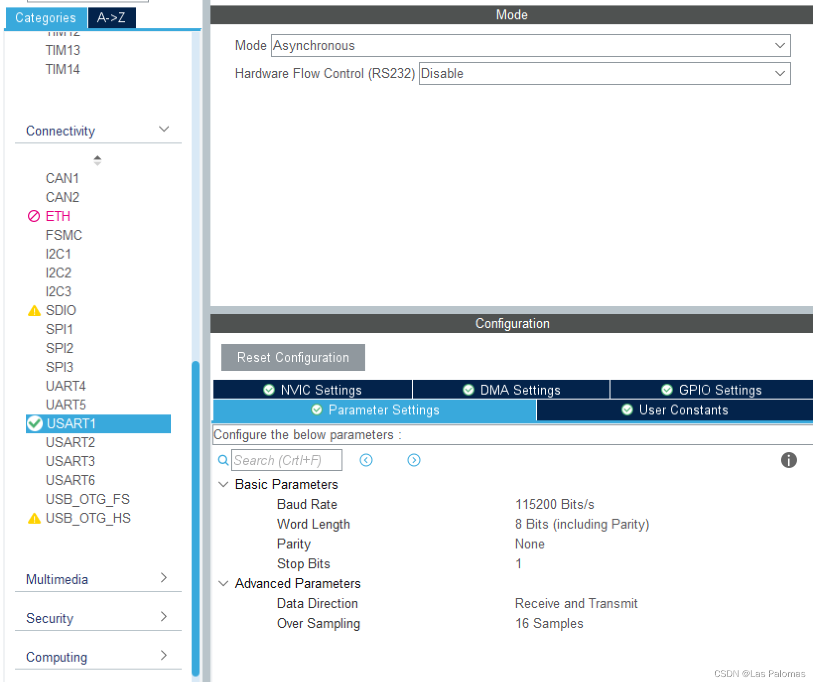 为了在中断处理函数中通过printf输出日期和其他更详细的信息,需要启用串口。在SYS中将Debug模式调为Serial Wire,并且启用USART1,设置为异步传输模式,波特率115200,其他默认就好。