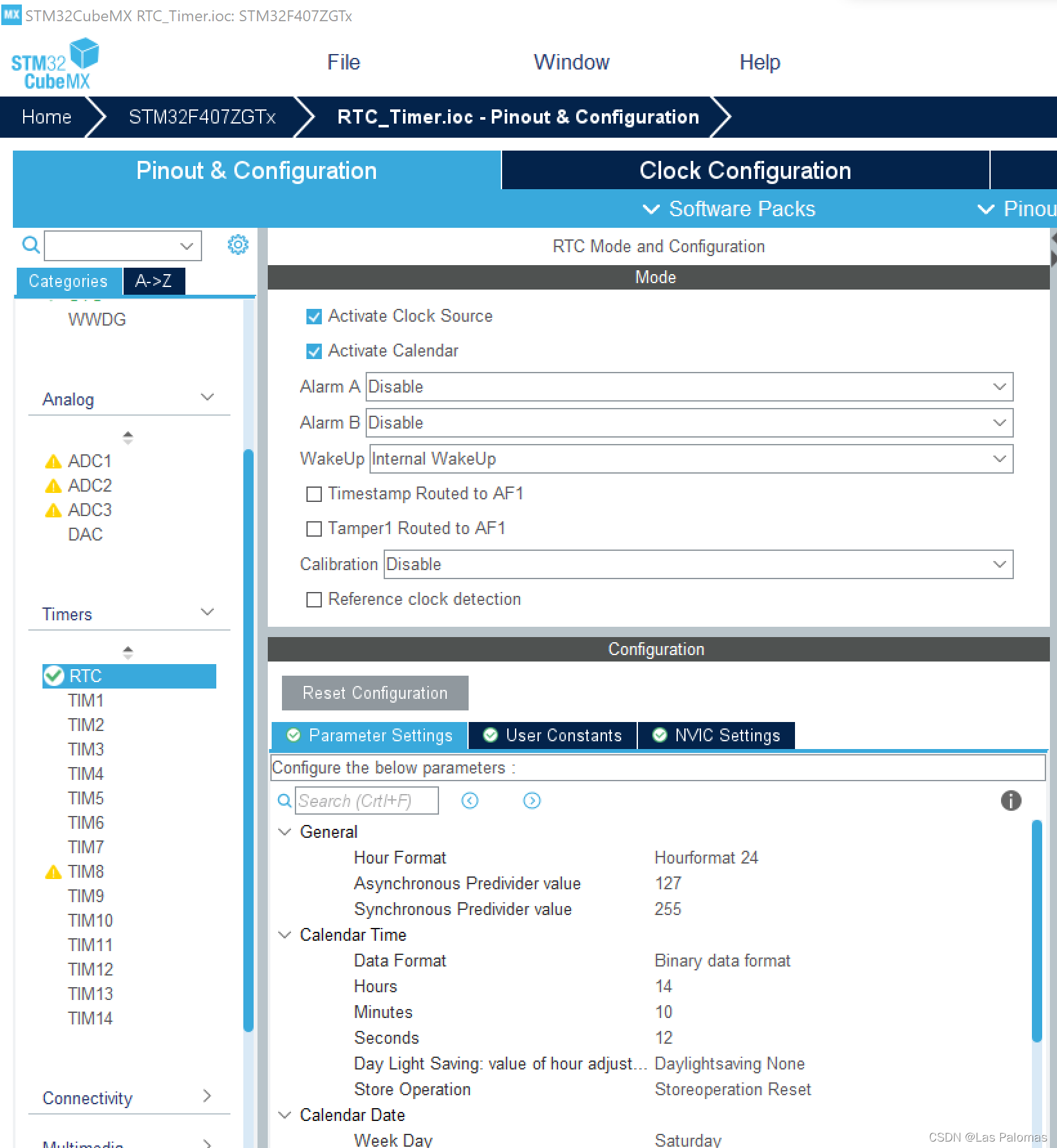 打开RTC时钟源和日历,启用内部时钟唤醒,把时间调为24小时制,存储模式用二进制(这点很重要!!!等会读取时间的时候也要以二进制形式读取,否则数字会有偏差),设置好时分秒以及年月日、星期几,根据自己需要是否关闭夏令时,唤醒定时器的时钟输入设置为1Hz(即RTC_WAKEUPCLOCK_RTCCLK / 16),其他参数默认就好