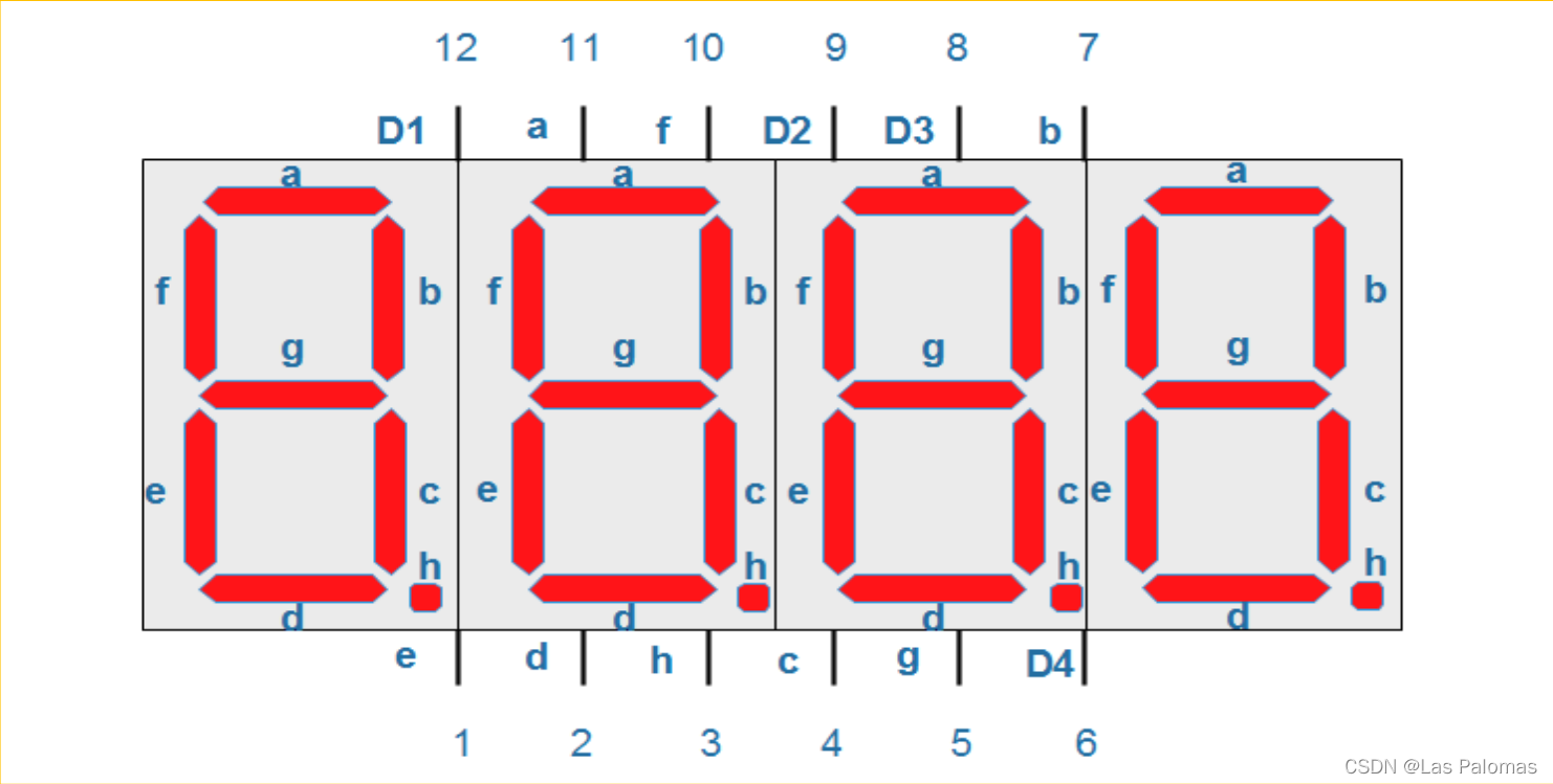 如下图,四位七段数码管有12个引脚。除了显示"abcdefg"的7段和显示小数点的"h"之外,还有4个引脚D1、D2、D3和D4用作"位"引脚。当四个数码管的"位"引脚为高电平时,相应的数码管被点亮。 四个数码管的显示原理是连续扫描D1、D2、D3、D4,然后相应的八段管依次亮起。由于点亮速度很快,小于人眼分辨的时间差值极限,所以看起来就像四个数码管同时显示。