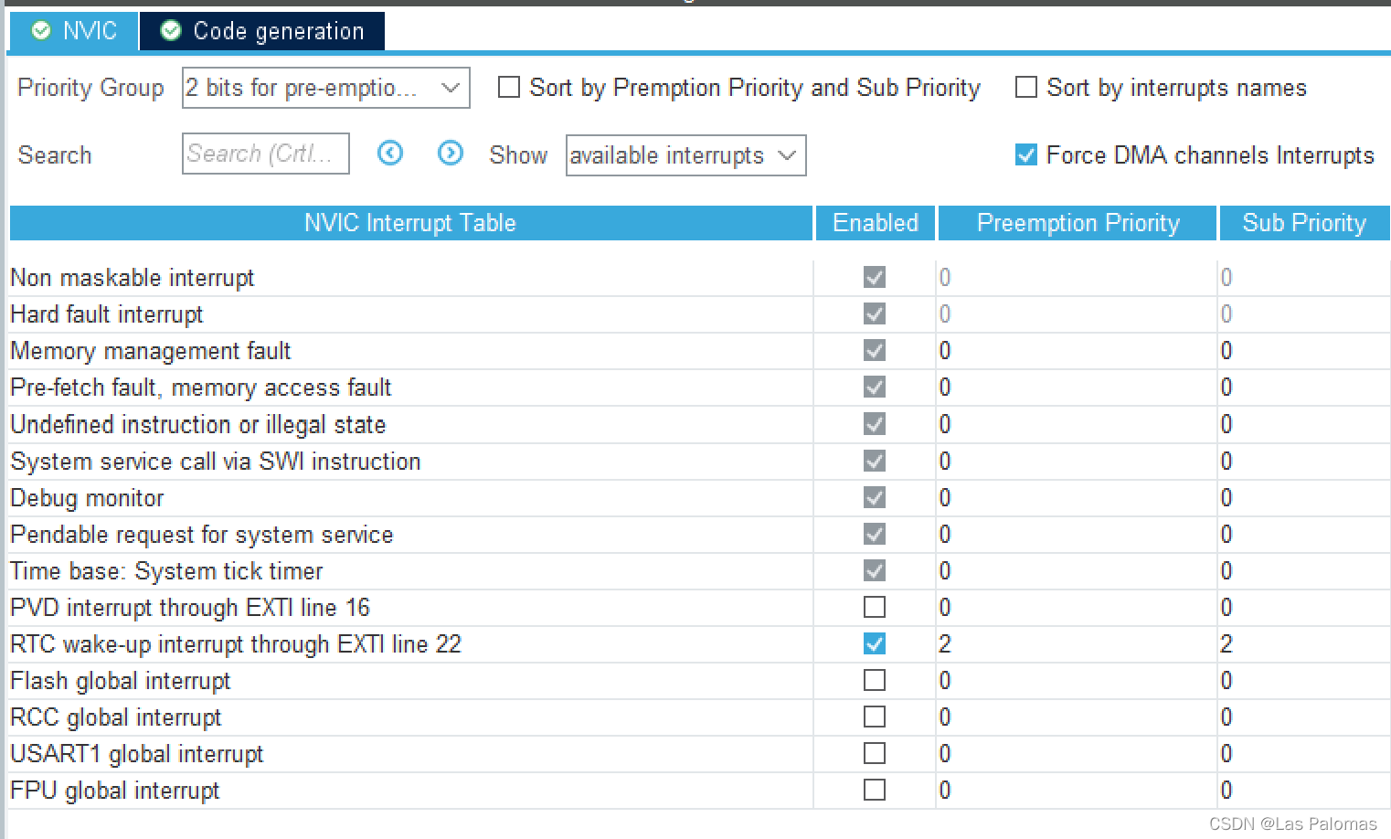 ?接下来配置唤醒中断以及优先级。在这里,我将中断优先级分组设置为2位抢占优先级、2位响应优先级,同时将唤醒中断激活并将抢占、响应优先级均设置为2,以保证不会干扰其他系统底层中断的运行。最后勾选生成中断请求处理函数和HAL调用处理函数。