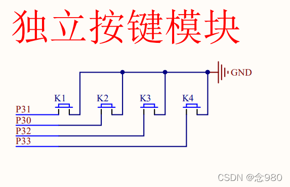比如这里的独立按键模块,按道理来说K1应该接P3_0,K2应该接P3_1,但是这里却反过来了(原因不详,应该是设计问题)。