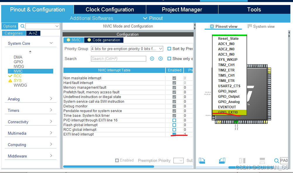 二、进行外部功能的配置 ? 把PA0设置成外部中断的模式(GPIO_EXTI0) ? 把设置的中断打开并把他的优先级调低一些(避免与上面的系统中断冲突)