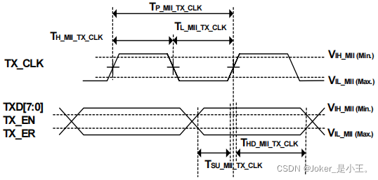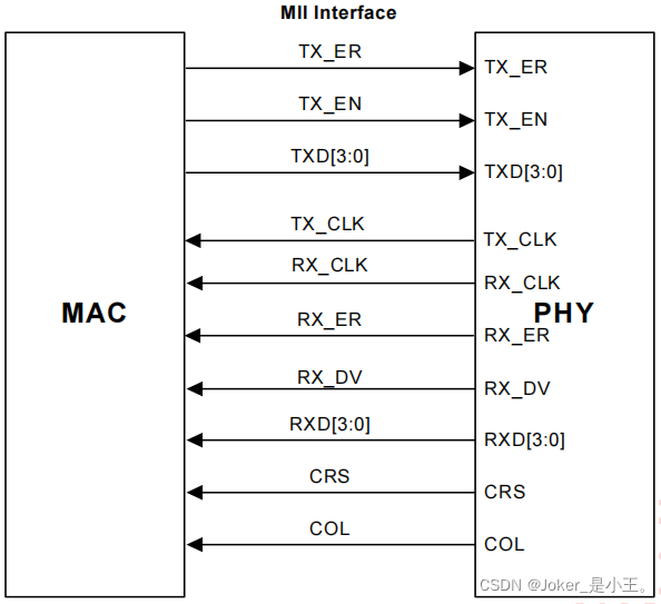 2.MII的数据接口是4位宽的,且需要注意,发送时钟TX_CLK的方向是从PHY到MAC,时钟由PHY提供,这是与GMII及RGMII口不同的,RX_CLK方向也是从PHY到MAC