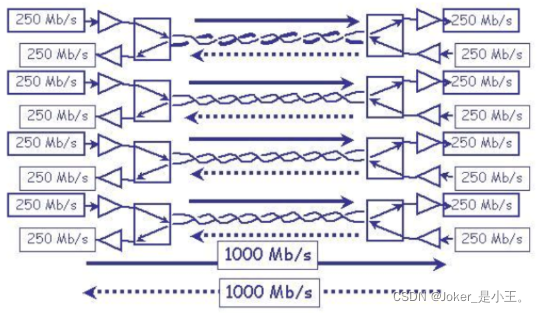 1000Base-T采用4对5类双绞线完成1000Mbps的数据收发,每一对双绞线传送250Mbps的数据流,?使用非屏蔽双绞线作为传输介质传输的最长距离是100米,1000BASE-T不支持8B/10B编码方式,而是采用更加复杂的编码方式。