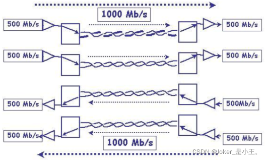 1000Base-TX也是基于四对双绞线,但却是以两对线发送,两对线接收( 类似于100Base-Tx)。由于每对线缆本身不进行双向的传输,线缆之间的串扰就大大降低,同时其编码方式也相对简单。这种技术对网络的接口要求比较低,不需要非常复杂的电路设计,降低了网络接口的成本。