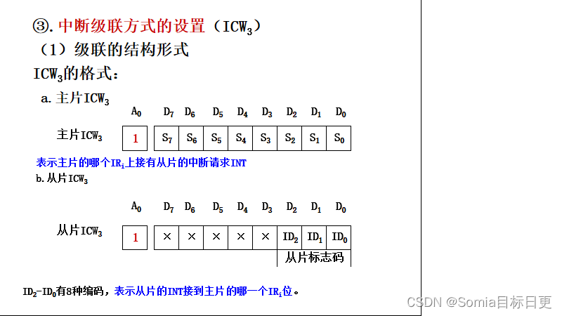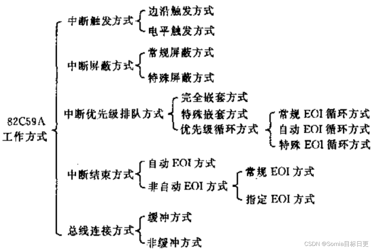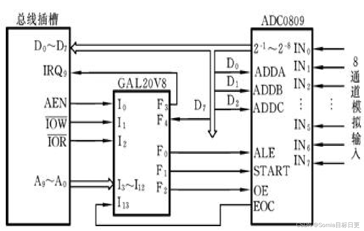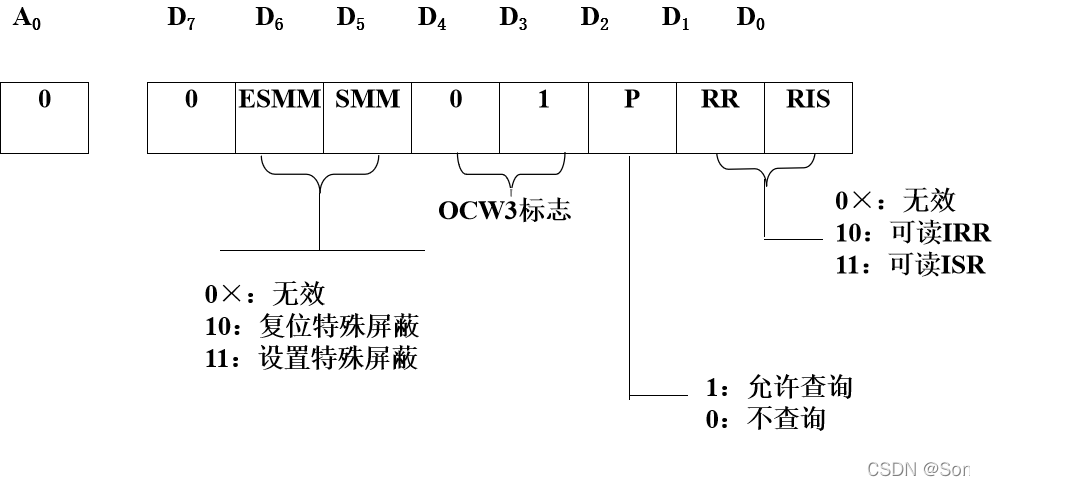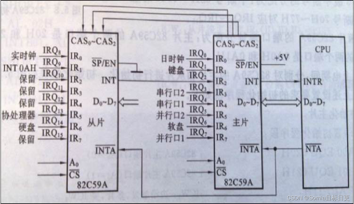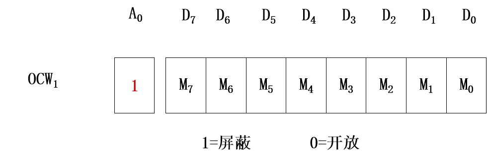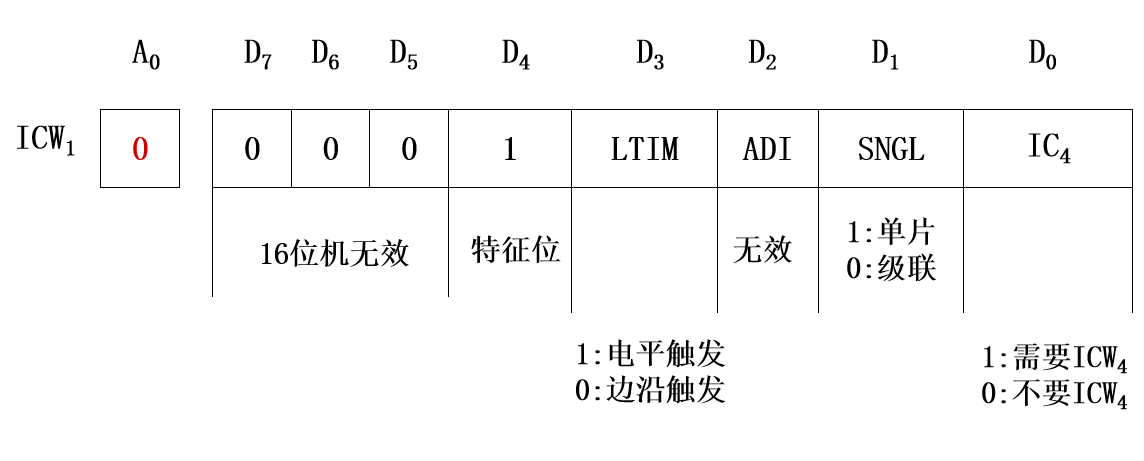 - A0:8259A两组内部寄存器的选择信号输入引脚,决定8259A的端口地址