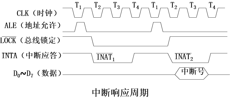 - ++读取中断号++:第二个INTA2使CPU撤销总线的封锁信号,中断控制器将中断号送到数据线,由CPU读入。