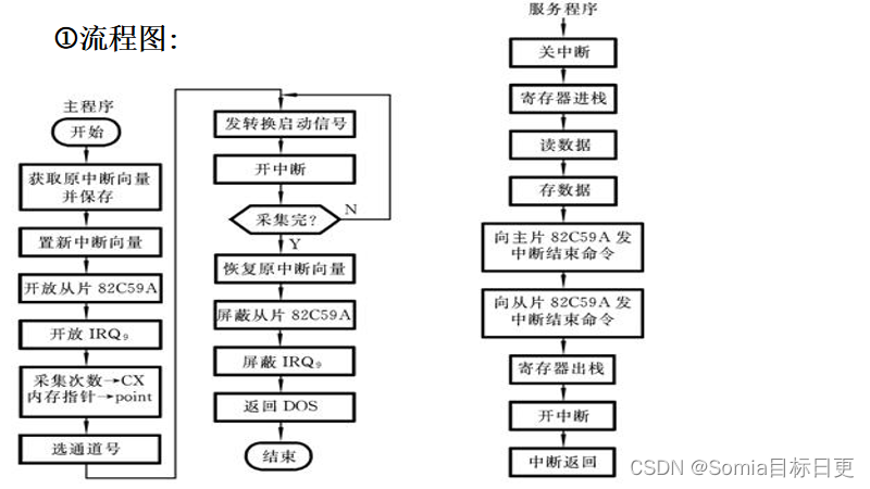 例:中断用于数据采集系统 (1)要求:从通道5采集1024个8位数据;数据以中断方式送缓冲区BUFR;结束信号EOC经GAL20V8组合后送IRQ9去中断请求;指定方式结束;A/D转换器ADC0809的选择端口地址320H,启动为321H,读数端口为322H;主片82C59A端口:OCW1端口为21H,OCW2端口20H;从片OCW1的端口0A1H, OCW2的端口为0A0H。 电路图:  (2)分析: 中断源:由ADC0809的转换结束信号EOC的上升沿申请中断。 中断:由于是从IRQ9引入中断请求,因此连到从片82C59的IR1端口,其中断号是71H; 82C59的两个端口地址是0A0H和0A1H。 操作:由于是主从结构的82C59中断控制,所以对主从片都要进行操作。 在程序设计时,按主程序和服务程序两个模块进行设计,而利用系统的中断资源,不需要进行初始化。   程序