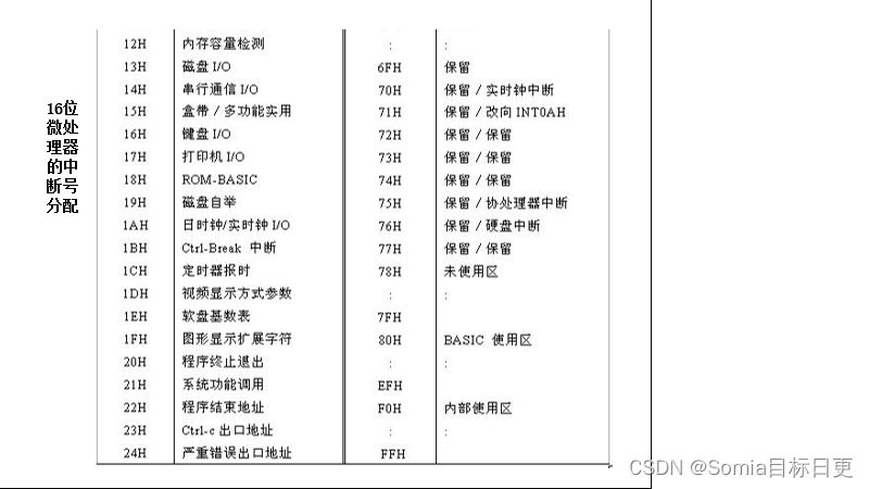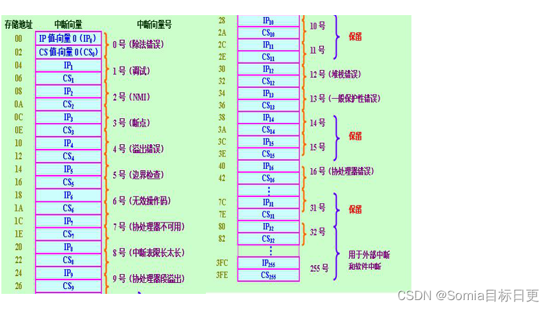 - 该服务程序的入口地址由段基址CS(2个字节)和偏移地址IP(2个字节)两个部分共4个字节组成。此即为中断向量