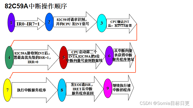 - 在中断服务程序中,使用OCW2发中断结束信号EOI,使用IRET中断返回