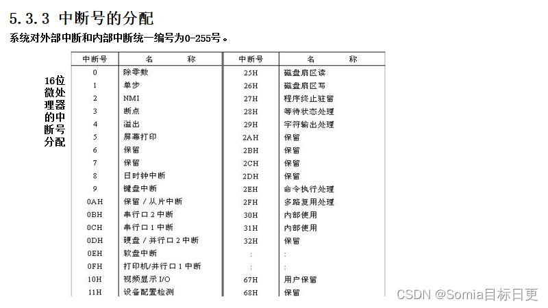 由程序中发出中断指令INT n 产生的,n为中断号。软中断处理过程中,CPU不发中断响应信号,也不要求中断控制器提供中断号,包括DOS中断功能和BIOS中断功能。