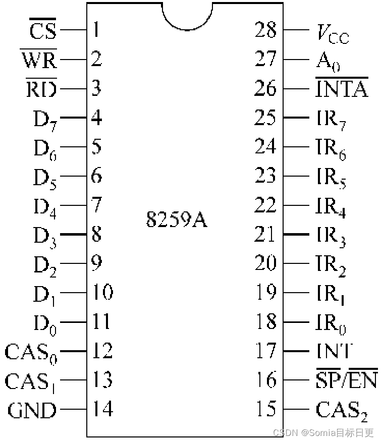 - CS(上划线):片选信号输入引脚,低电平有效,决定了8259A的端口地址范围