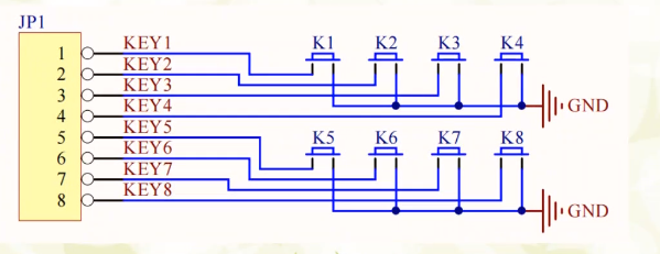 当按键按下时,管脚得到低电平(输入0),将K1-8分别关联LED1-8,当该按键所接的IO口收到低电平信号时,对应LED灯输出值取反(点亮/熄灭)。
