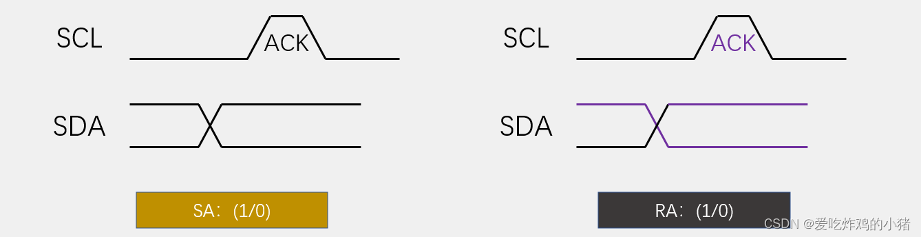 发送应答(主机发送到从机):在接收完一个字节之后,主机在下一个时钟发送一位数据,数据0表示应答,数据1表示非应答