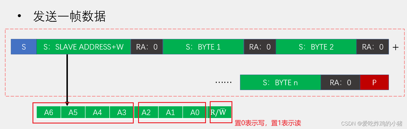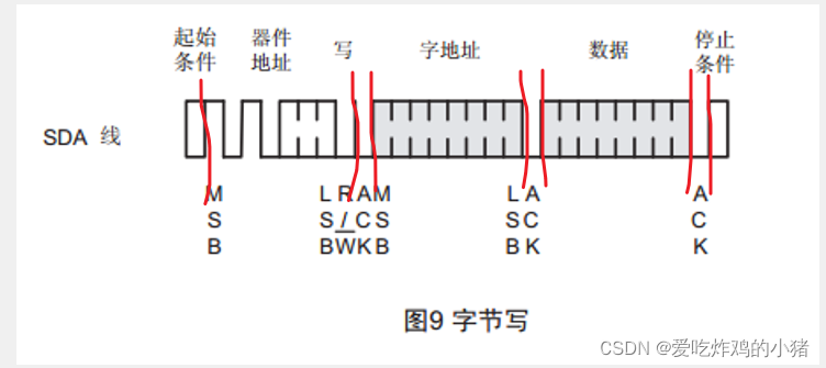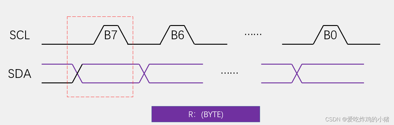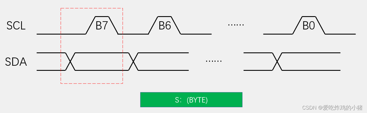 SCL低电平期间,主机将数据位依次放到SDA线上(高位在前),然后拉高SCL,从机将在SCL高电平期间读取数据位,所以SCL高电平期间SDA不允许有数据变化(也就是说我们只有在SCL低电平的时候才能变化SDA的数据),依次循环上述过程8次,即可发送一个字节