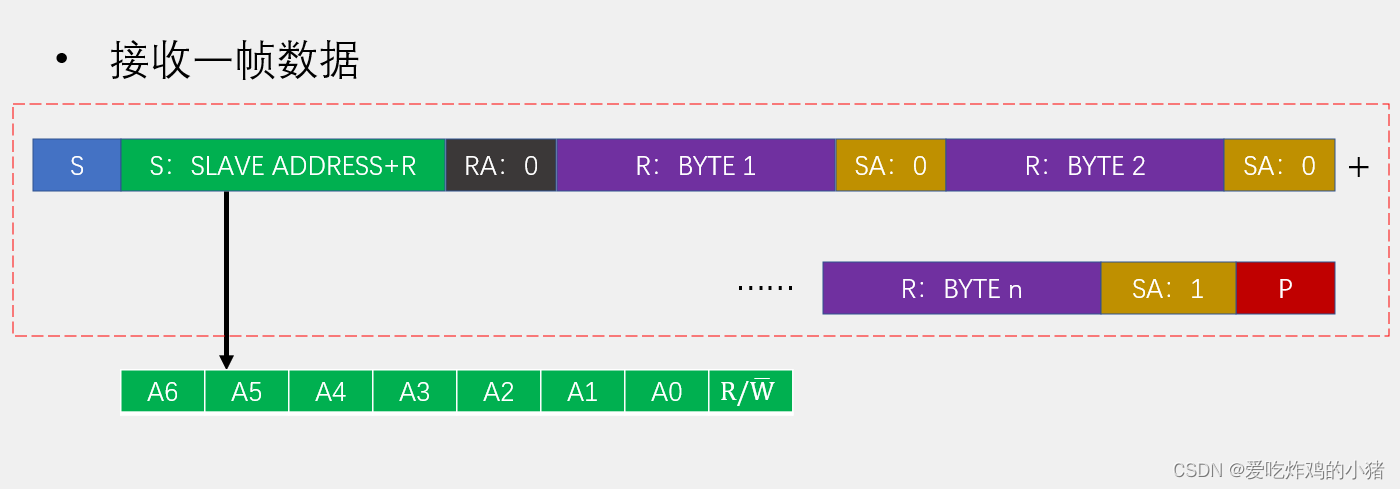 SCL低电平期间,从机将数据位依次放到SDA线上(高位在前),然后拉高SCL,主机将在SCL高电平期间读取数据位,所以SCL高电平期间SDA不允许有数据变化,依次循环上述过程8次,即可接收一个字节(主机在接收之前,需要释放SDA,即将SDA置1,因为单片机上电的时候默认所有的接口都为高电平1)
