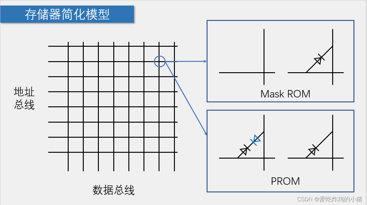 后来,就发明了一种叫做PROM的储存器,看下面的图片可以知道,他一条线上有2个二极管,在制造出来后,我们进行写入程序,利用高电压击穿,使其烧毁,使得其一条线上只具有一个二极管,但是这种写入程序的方式是不可逆的,所以写入的时候又叫烧写。