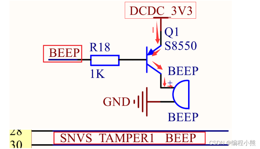 通过一个 PNP 型的三极管 8550 来驱动蜂鸣器,通过 SNVS_TAMPER1 这个 IO来控制三极管 Q1 的导通,当 SNVS_TAMPER1 输出低电平的时候 Q1 导通,相当于蜂鸣器的正极连接到DCDC_3V3,蜂鸣器形成一个通路,因此蜂鸣器会鸣叫;当 SNVS_TAMPER1输出高电平的时候 Q1 不导通,那么蜂鸣器就没有形成一个通路,蜂鸣器也就不会鸣叫 ?