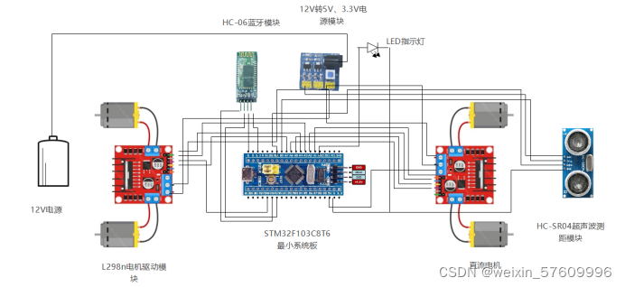 硬件设计主要包括以下几个模块:超声波收发系统、蓝牙接收系统、L298n电机驱动模块。