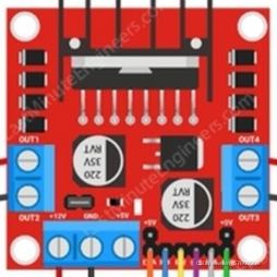如图,中间的三个接线端从左到右分别为VCC、GND、+5,其中VCC为12V供电,GND为供电地,+5为5V供电;左右两边的接线端分别为输出A和输出B;排针部分引脚分别为ENA、IN1、IN2、IN3、IN4、ENB,其中IN1~4为逻辑输入,ENA和ENB为PWM使能,已经默认被接到5V,若要使用PWM调速可取下跳帽使用。