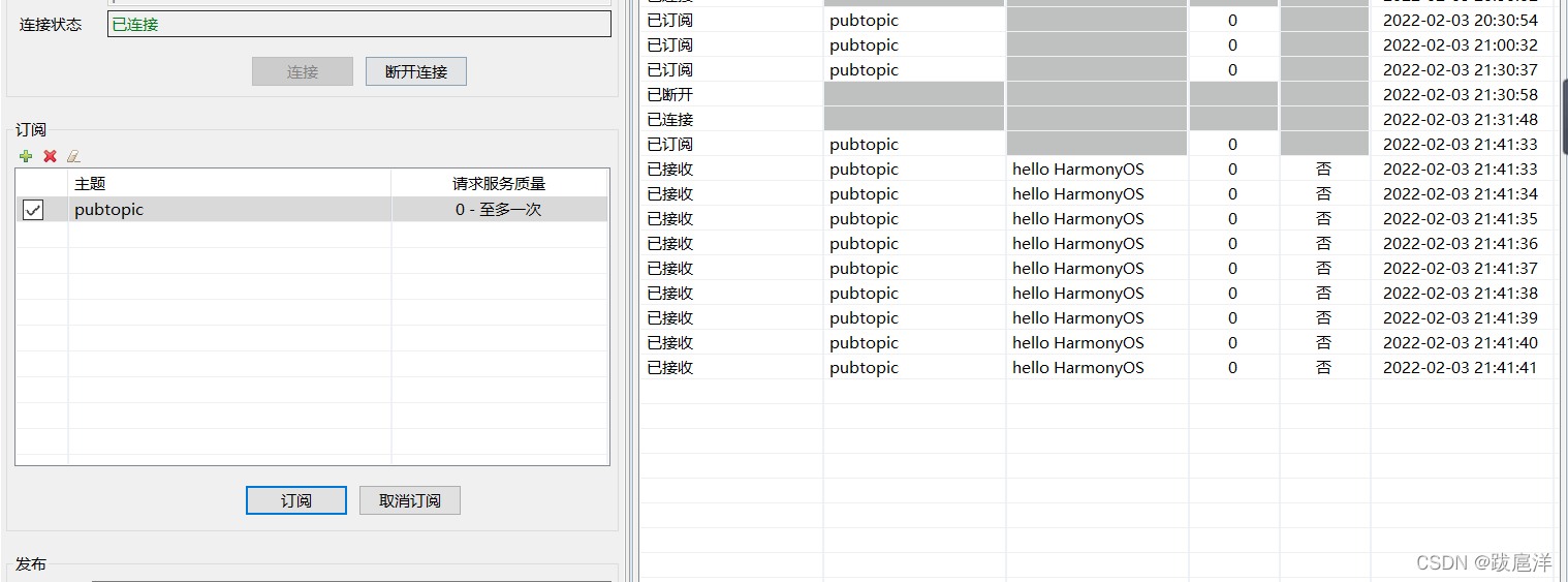 首先打开MQTT服务器,方法可查看https://blog.csdn.net/qq_44629109/article/details/122779727?spm=1001.2014.3001.5501 ,这篇文章 首先通过AT指令进行联网。 在串口调试助手发送”AT+STARTSTA“, 启动STA模式。 发送” AT+CONN=“BAHUYANG”,2,“123456789” “ 连接指定AP,其中SSID/PASSWORD为待连接的热点名称和密码。 发送”AT+STASTAT” ,查看连接结果。 然后我们输入我们的 MQTT测试的AT指令: AT+MQTTTEST 可以从串口调试助手上看到如下图。  然后查看MQTT客户端软件,可以看到右边已经有接收MQTT信息了,主题是 pubtopic,消息内容为 hello HarmonyOS ! ,说明实验成功。
