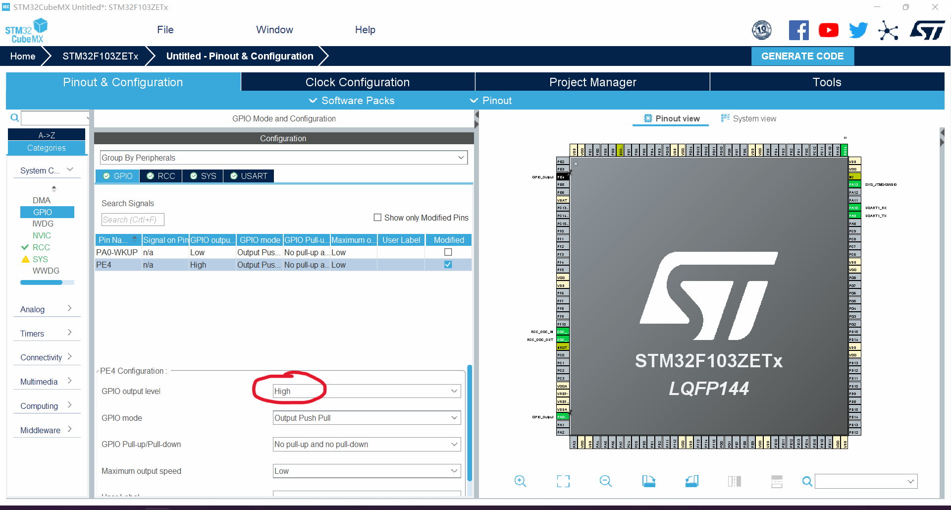 便于检测判断,将PA0输出低电位,将PE5输出高电位。