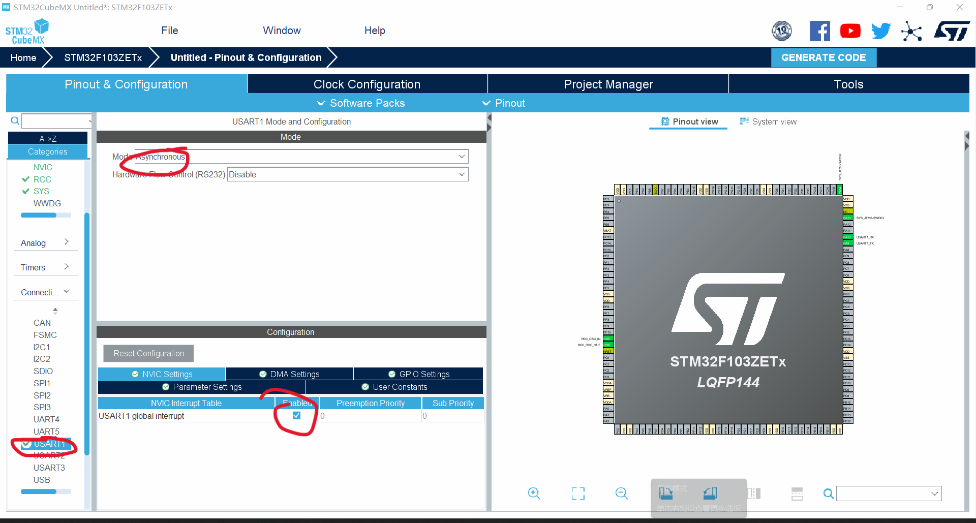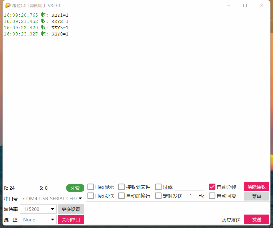 进行编译,连接单片机后烧写。连接串口1和电脑。打开串口助手。