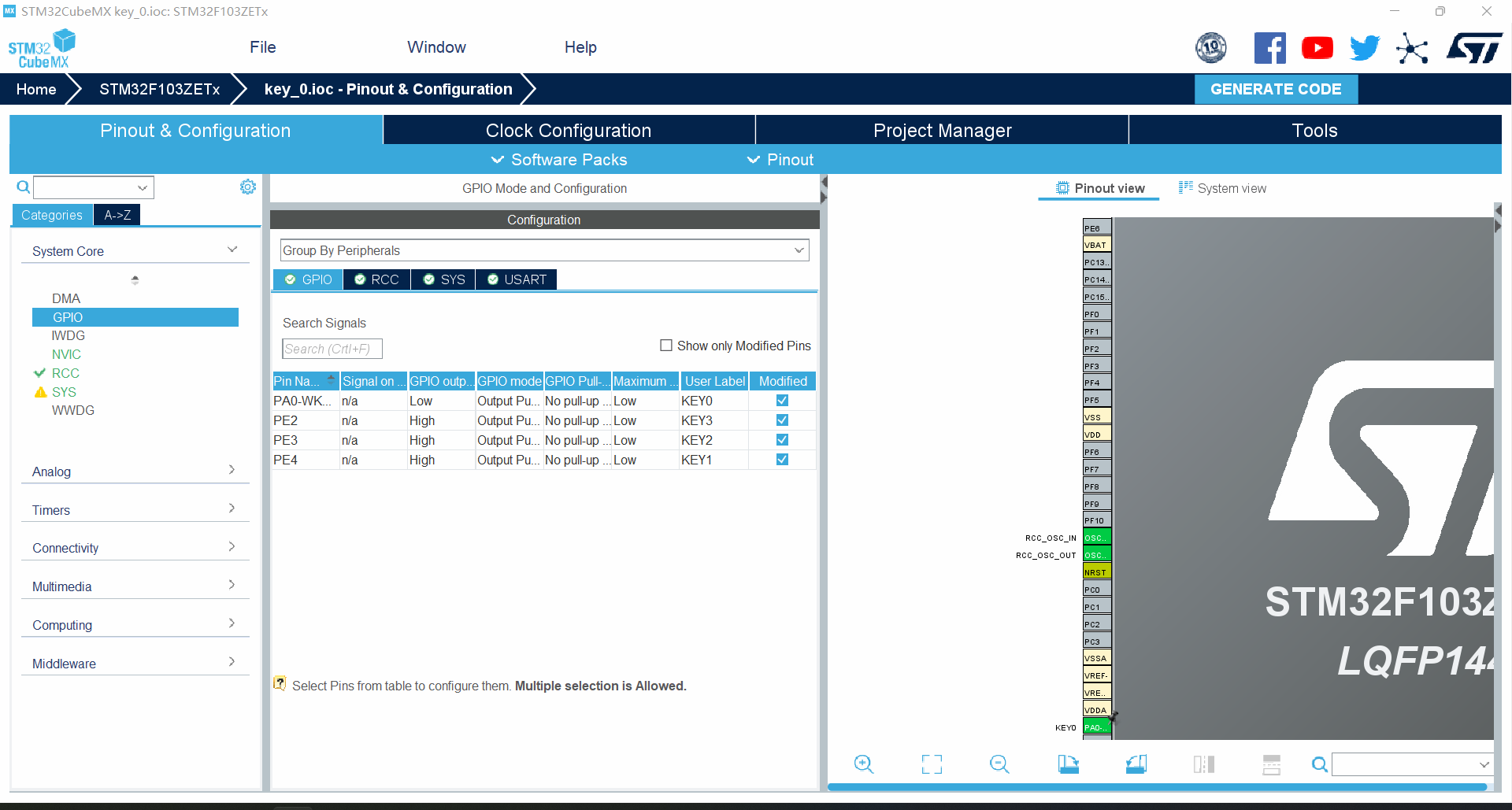 在gpio设置中加入其他几个按键对应的引脚,调节输出的电平高低,有需要可以对引脚进行命名。