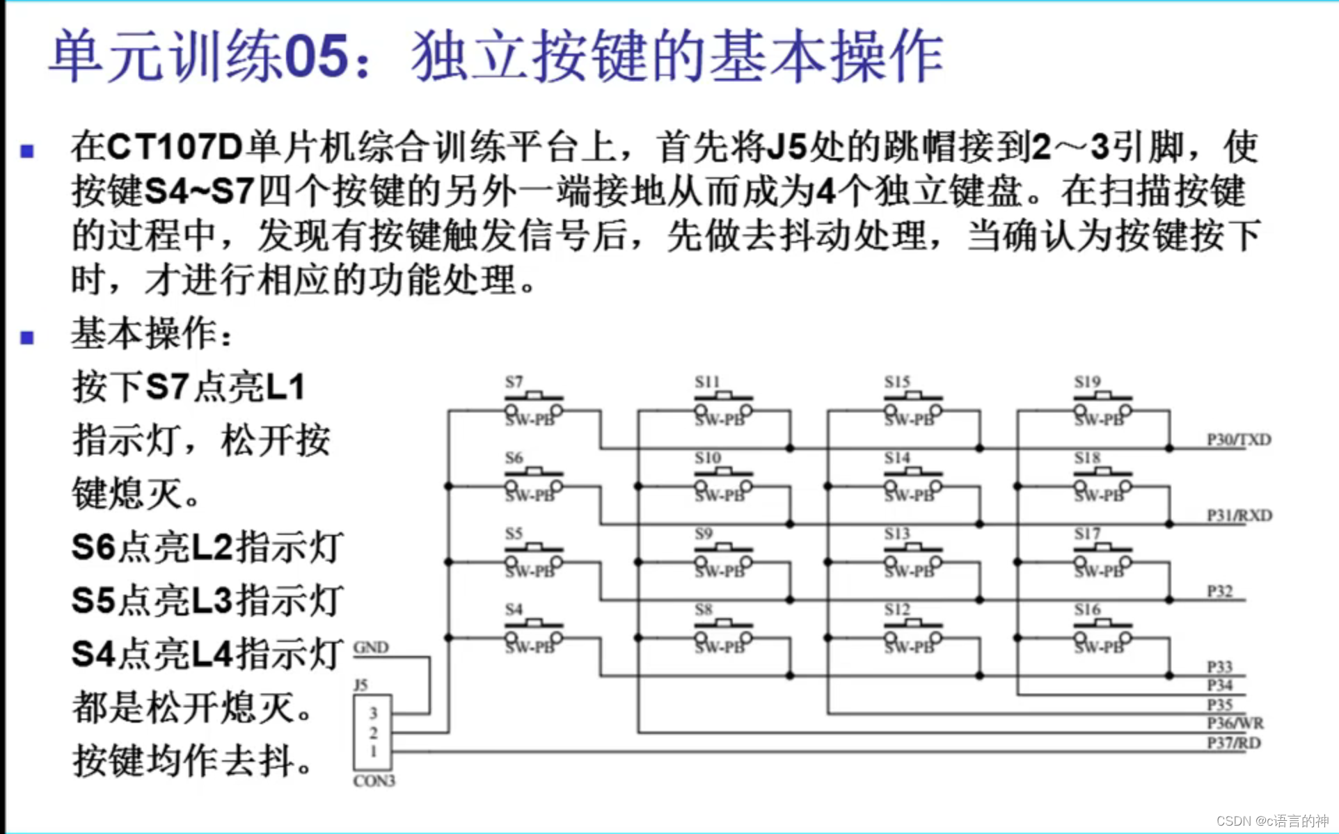 ? ? 首先使用sbit来确定哪个LED连接在哪个引脚,哪个按键连接在哪个引脚。关键函数为ScanKeys_Alone(),首先打开Y4C对应的寄存器,使用if函数判断如何S7按下,则S7=0,然后实现一个延时函数,再使用if(S7==0)再确认一次,这一步的作用为消抖,防止有干扰信号。L1=0,实现LED1亮起,while()函数保证S7按下时能使LED1一直亮着,松开后L1=0,LED1灭。其他LED原理相同。