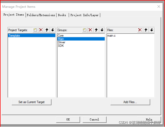 再点击“Groups”的 新建图标,创建一个新的组,名为“Driver”,该组没有文件,无需添加。再新 建“SDK”,加入“SDK\STM32F1xx_HAL_Driver\Src”下的几个必须文件。