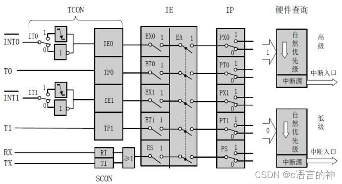 上面是51单片机的中断系统结构,这决定了你的中断向量,也就是中断初始函数需要如何写,首先图中INT0?代表着外部的输入,我们需要让IT0,EX0,EA等于1。接下来是中断服务函数的书写