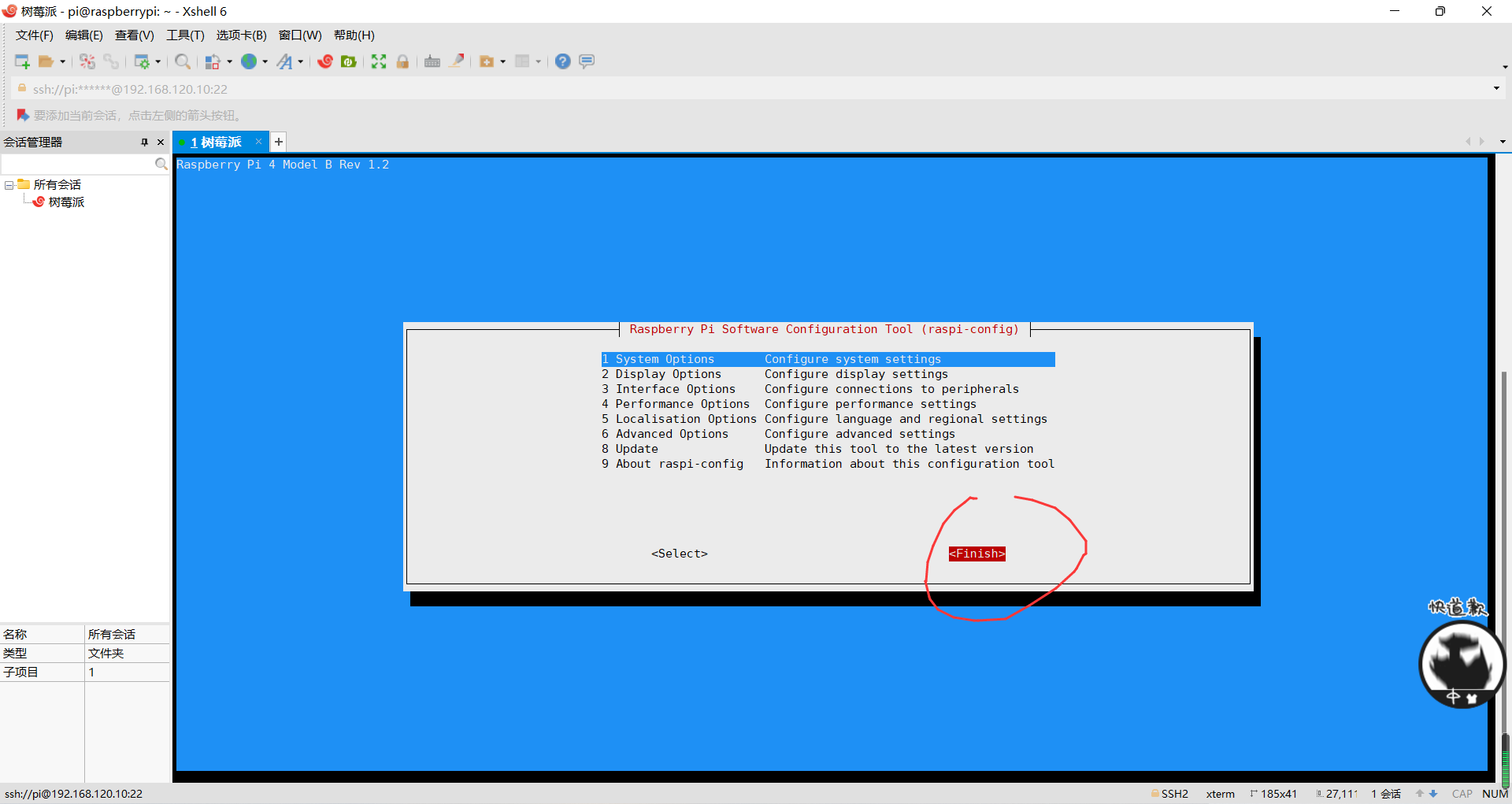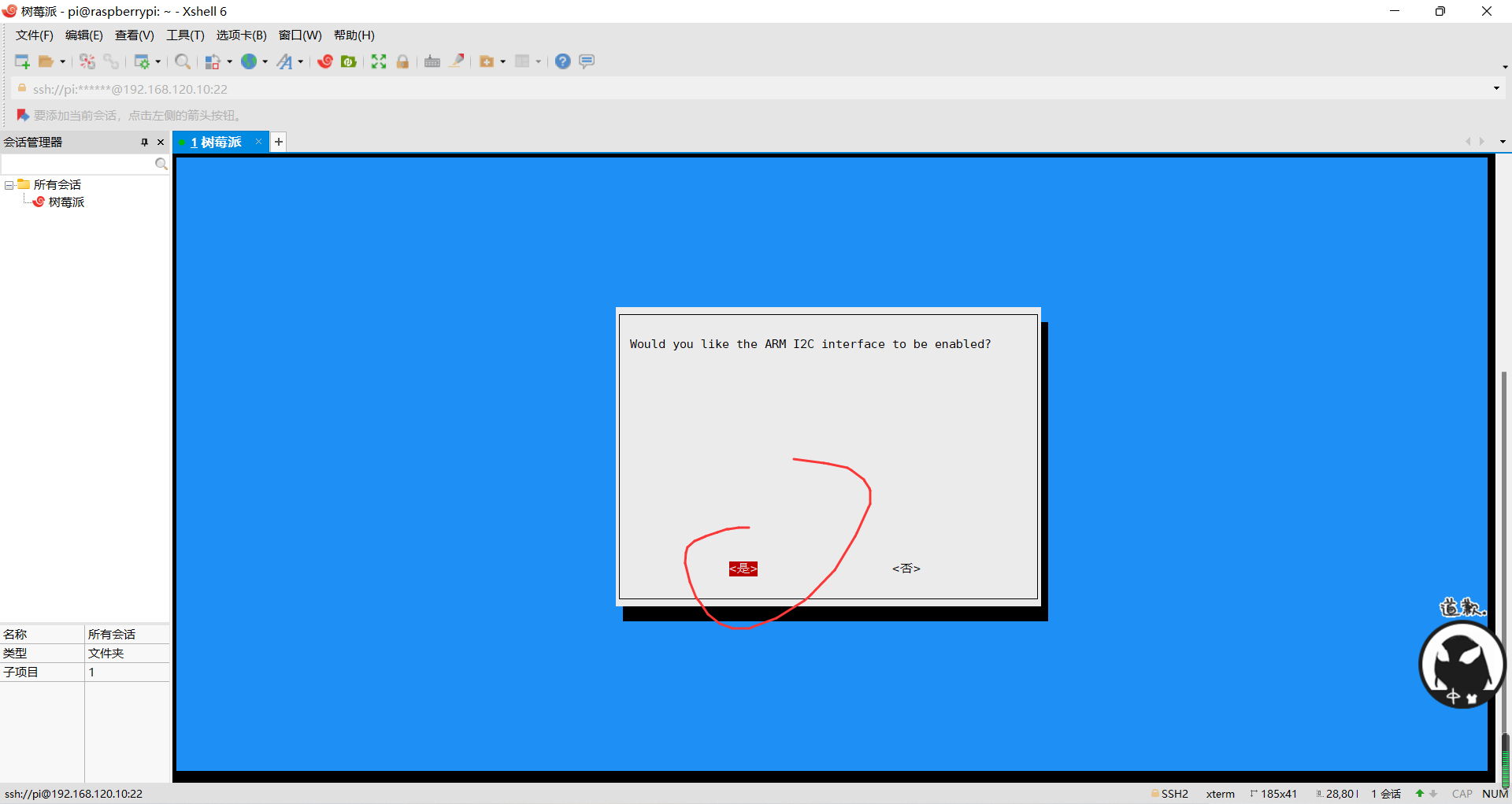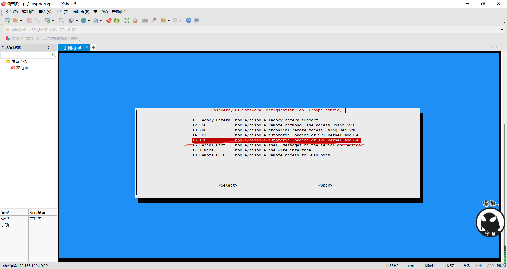 使用putty或者Xshell登录树莓派,在终端命令输入sudo raspi-config,回车 进入如下界面。  用键盘上下选择3.Interface Option,回车,利用键盘上下选择I5 I2C 回车;  继续回车;  再继续回车;  利用鼠标右键选择finish,回车,返回命令窗口;  输入sudo reboot,重启树莓派。