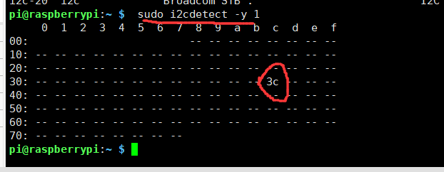 在命令行输入: sudo i2cdetect -l 回车,出现如下显示,说明使用的是I2C1接口。  然后输入: sudo i2cdetect -y 1,回车,会出现下面的显示,这里的3C就是OLED的地址(此时树莓派I2C不挂接其他的器件),一般的0.96寸OLED屏幕的地址都是0x30。