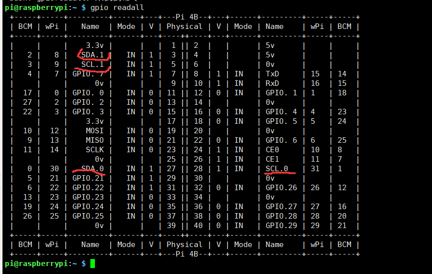 打开终端命令,输入gpio readall,回车,在返回的IO表中可以看见有SDA1、SCL1;SDA0,SCL0两组I2C接口,我们使用SCL1与SDA1这一组进行。