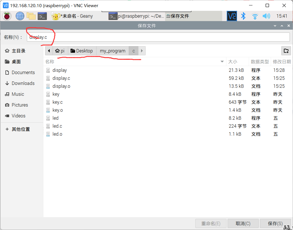 然后命名保存,笔者觉得之前的代码一直放桌面太凌乱了,所以自己新建了文件夹,把代码放在了文件夹内,大家根据自己需求来就行。  由于我修改了目录所以编译的时候也就变了 输入是:cd Desktop/my_program/c(切换到我保存文件的目录)回车 然后输入gcc -o display display.c -lwiringPi 编译和生成执行文件 回车 最后 sudo ./display 回车 运行就可以看见如下效果了 。  可能是由于I2C的速度不够,导致看起来很不舒服,后面打算换个SPI的屏幕再试试,有关取模方法大家参考这篇博文就行,也可以私聊笔者要文档教程。
