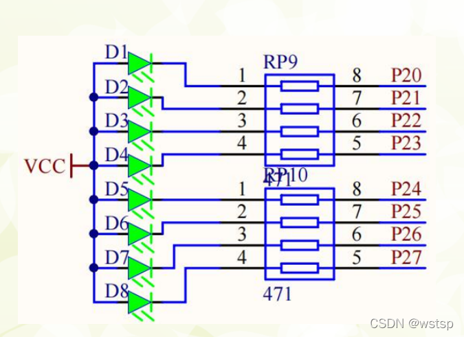 这个是led的电路图,普中的a2系列开发版中led的连接只需设置好管脚就可以了,不需要自己进行杜邦线单独接线,还是很方便的,唯一不足就是有的时候不能同时实现多个功能。