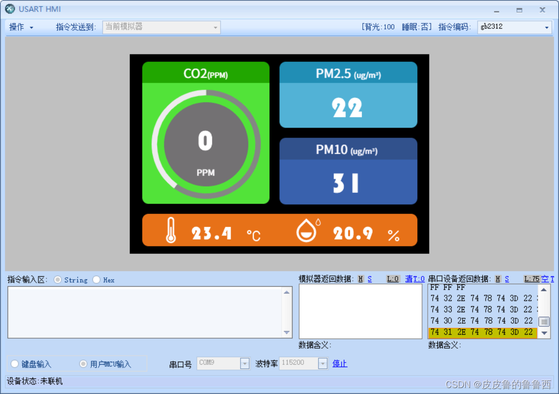 sprintf(pm25,"t2.txt=\"%d\"\xff\xff\xff",(back_data[6] * 256 + back_data[7])); //格式化PM2.5数据并赋值给t2.txt( 串口屏定义的PM2.5控件),传感器返回帧6、7位是16进制PM2.5数据