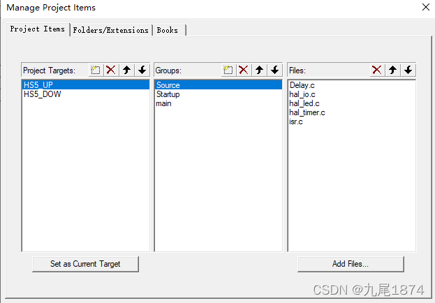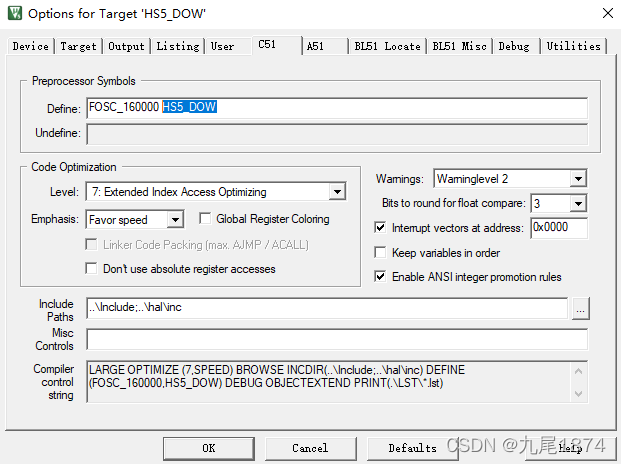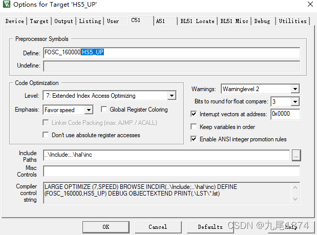 - 上方可以看到,我们定义了两个条件HS5_DOW和HS5_UP,若需要使用则可以在keil5里面的工程选项里面的Define添加上HS5_UP和HS5_DOW即可,如下图所示。