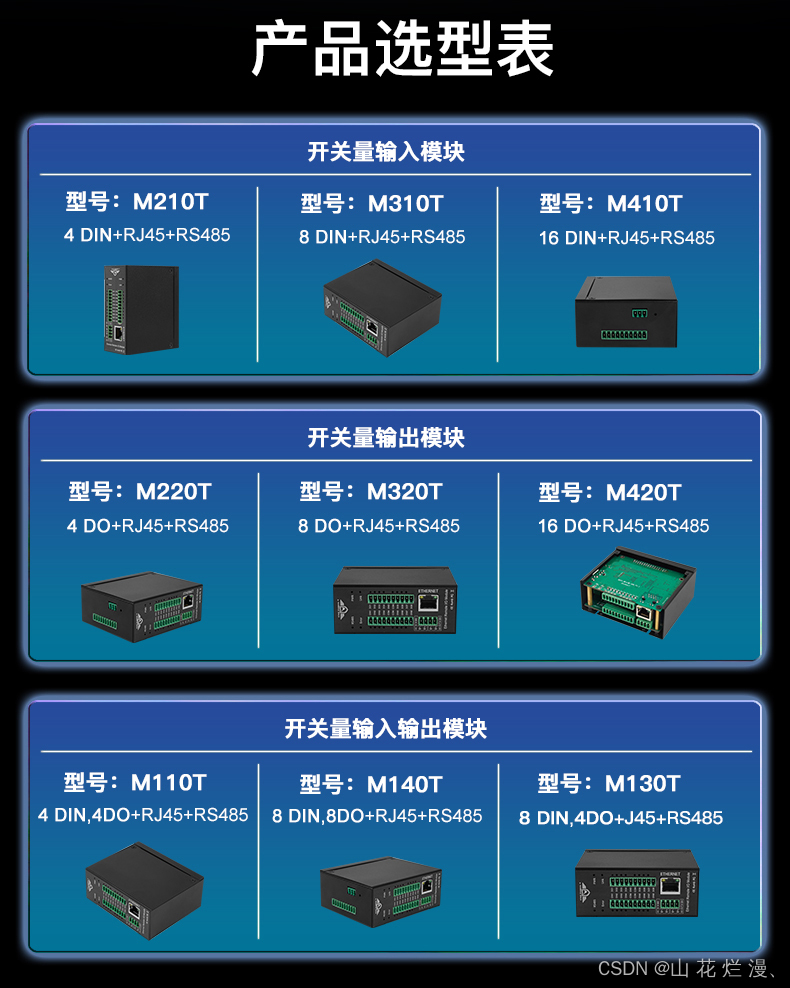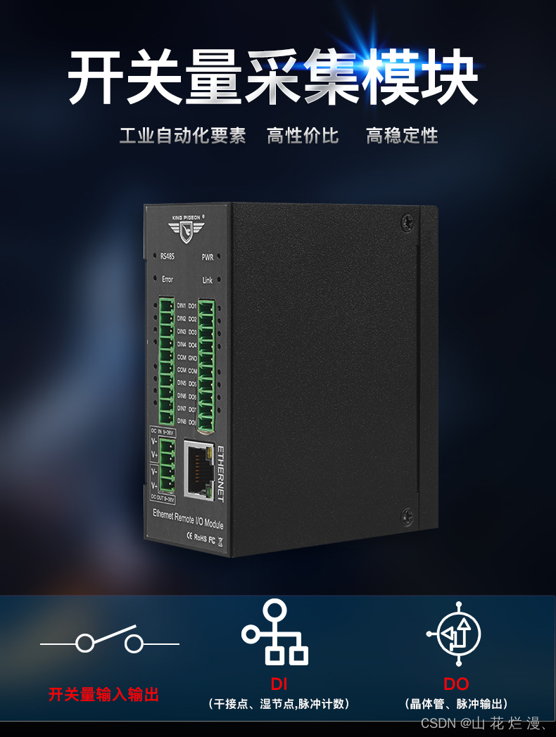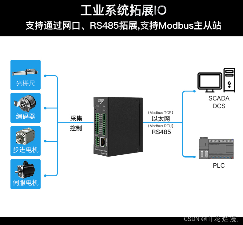 远程IO模块,是工业级远程采集与控制模块,该模块提供了无源节点的开关量输入采集,继电器输出,高频计数器等功能。可将系列内多个模块进行总线组网,使得IO点数得到灵活扩展。模块可以由远程命令进行控制。该模块采用工业级元器件,10-30VDC宽电压输入,能够在-30℃~60℃范围内正常工作,支持RS232、RS485通信模式,通信协议采用工业标准的Modbus RTU协议。系列远程采集与控制模块,采用 RS232、RS485通信模式与上位进行数据交互,通信协议为工业标准的Modbus RTU协议,ModBus协议定义了一个控制器能认识使用的消息结构,而不管它们是通过何种网络进行通信的,它制定了消息域的格局和内容的公共格式,描述了一个控制器请求访问其它设备的过程,回应来自其它设备的请求,以及侦测并记录错误信息。通过此协议,控制器相互之间、控制器经由网络和其它设备之间可以完成信息和数据的交换与传送,使各种不同的公司和厂家的可编程逻辑控制器(PLC)、RTU、SCADA系统、DCS或与兼容ModBus协议的第三方设备之间可以连成工业网络,构建各种复杂的监控系统,并利于系统的维护和扩展,这个通讯协议已广泛被国内外各行业作为系统集成的一种通用工业标准协议。