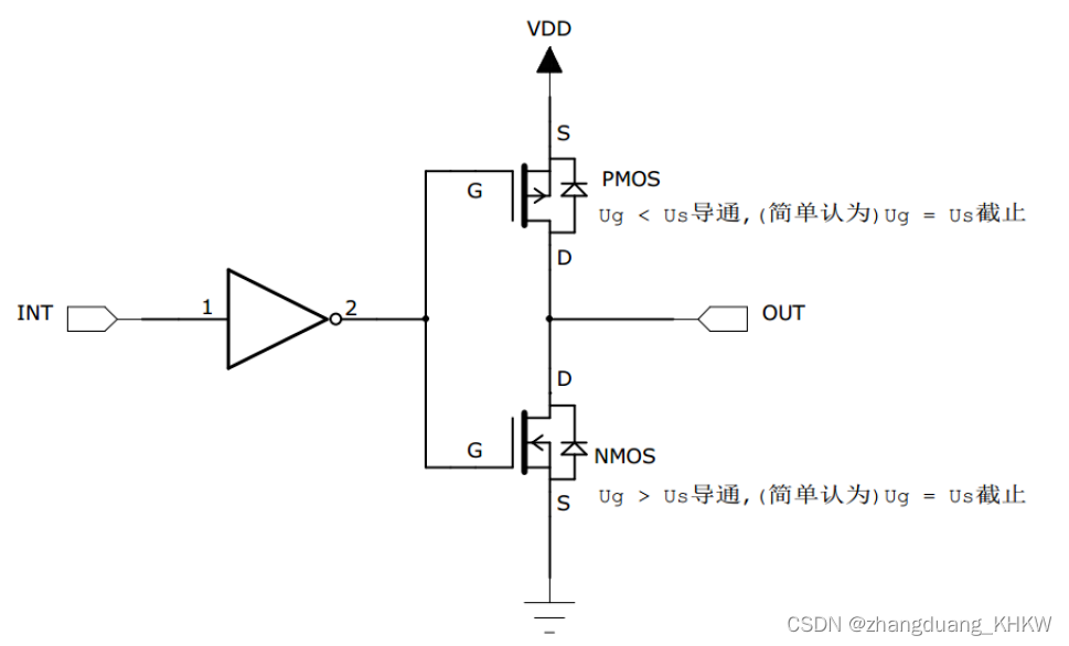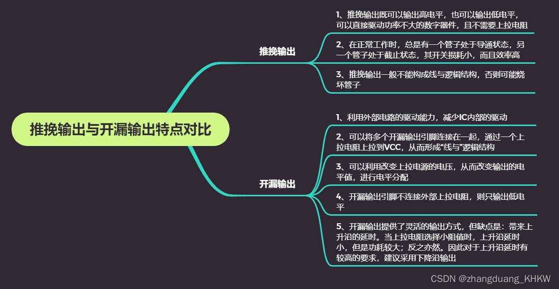 所谓推挽输出模式,是根据这两个MOS管的工作方式来命名的。在该结构中输入高电平时,经过反向后,上方的P-MOS管导通,下方的N-MOS关闭,对外输出高电平;而在改结构中输入低电平时,经过反向后,N-MOS管导通,P-MOS关闭,对外输出低电平。 当引脚高低电平切换时,两个管子轮流导通,P管负责灌电流,N管负责拉电流,使此电路结构的负载能力和开关速度都比普通的方式有很大提高。推挽输出的低电平为0伏,高电平为VDD提供的电压。