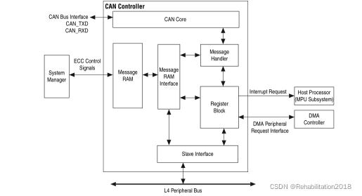 b.HPS引导流程 上电 reset 后,位于 HPS 中的 ROM 运行封装好的一段代码Boot ROM Boot ROM代码的作用是确定所选的boot源,重置后初始化HPS,将 preloader 映像从 flash 加载到OCRAM然后跳转到 preloader 。 所选的 Flash 类型 SDMMC 在 bsp-editor spl boot 选项中设置  OCRAM 由地址 0xFFFF0000知  Preloader 在完成Clock Reconfiguration、初始化SDRAM接口、配置HPS I/O引脚及复用、初始化加载下一阶段程序的接口后,将裸机程序引导映像从引导设备复制到SDRAM。并执行 SDRAM 地址0x00100000–0xC0000000  c. CAN裸机中断收发程序流程 1. 主程序框架  初始化:1.通过协议组寄存器模块(如CCTRL寄存器、CBT寄存器等)进行软件初始化(如设置比特率,设置通信模式等) 2.通过IF接口寄存器初始化Message RAM中的接收邮箱和发送邮箱(分别初始化)。 消息对象结构:掩码位、仲裁位、控制位、数据位  通过IF接口寄存器配置消息对象的掩码位、仲裁位、控制位、数据位,存储到Message RAM对应邮箱中请求发送。 Message Handler(状态机)接收到了请求,处理消息对象发送。 邮箱中的消息对象通过IF寄存器传输到CAN core中的移位寄存器,经过封装然后到达CAN 总线接口,进行数据帧的传送。