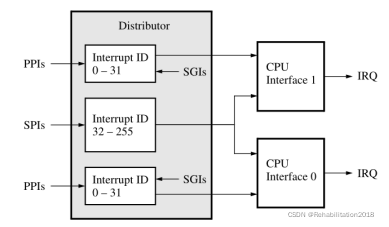 中断相关: GIC–中断控制器连接所有能够产生中断的I/O外围设备的IRQ中断信号。CAN0 控制器有4个中断信号连接到全局中断控制器 (GIC),  GIC 由分配器和 CPU 接口组成,分配器从I/O外设接收IRQ中断信号 CPU接口将分配器收到的IRQ请求发送给Cortex-A9处理器。  中断信号可以分为3种 1.SPI(shared peripheral interrupts):该中断由中断控制器可以路由到多个内核的外设生成.中断号32-211 2.PPI(private peripherals interrupts):专用于单个CPU .中断号27-30 3.SGI(software generated interrupts):由软件通过写入专用分配器寄存器生成.中断号0-15