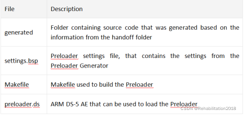 a.Preloader部分 最终需要生成 u-boot-spl 二进制文件进行相关硬件初始化,并且引导加载裸机程序 那么怎么得到u-boot-spl ? 首先,我们需要知道配置 HPS 的信息,如使能的外设,管脚的复用等 对此,可以编译上面说明的硬件设计,得到.sof文件(经由USB Blaster下载到板子中)和handoff文件夹,handoff文件夹中包含了这些信息 然后,经由 preloader 生成器,也就是bsp(板级支持包) editor 将 handoff 文件夹里的信息转换成源代码、 另外生成 preloader 设置文件、 preloader 调试脚本以及编译 preloader 所用的 makefile。 由此我们得到了源文件,但是和我们最终想要的二进制文件存在差异,需要借助 makefile进行编译。 Bsp editor支持多种型号板子的 preloader 配置信息的生成  generated文件夹可以看到许多头文件与C语言文件,这些文件是用来更新uboot中相关文件的,主要涉及到系统配置,IO复用,DDR初始化等 Makefile 制定了编译规则,生成最终的二进制文件,执行以下步骤: 1.把 generated文件夹下的相应文件拷贝到uboot-socfpga/board/altera/socfpga与下面sdram子目录 2.通过下面的变量设置