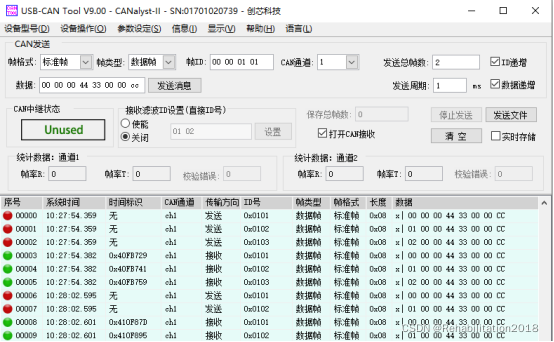 每当USB-CAN Tool 发送一个消息对象,程序触发中断,进入中断服务函数,将接收到的消息对象再返回发送到USB-CAN Tool中,如下图所示。
